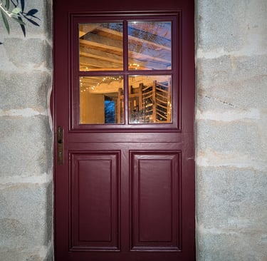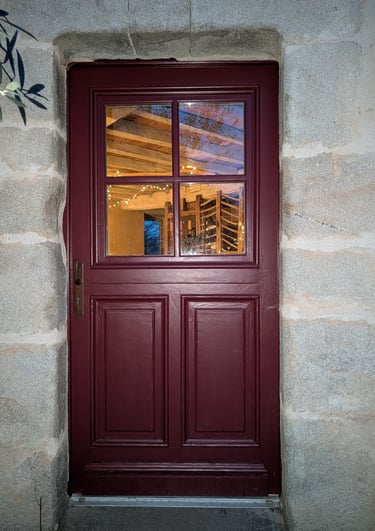 Il y a chez moi une porte que j’aime bien. C’est une porte en bois. Elle est en partie vitrée. Je l’ai peinte en rouge côté extérieur. C’est un rouge dit « basque ». A l’intérieur, elle est plutôt beige. C'est un beige chaud, agréable. La partie vitrée est sa moitié supérieure. Cette partie est comme une porte dans la porte puisqu’elle s’ouvre indépendamment du bas.